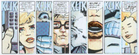 La presenza di strutture come quelle desumibili dal punto b) non impedisce un’organizzazione in senso cinematografico di un testo a fumetti: semplicemente, esse costituiscono la codifica sulla tavola di qualcosa che il fumetto non può ottenere con gli stessi mezzi del cinema. Ora, alla luce di queste ultime considerazioni, possiamo concludere che proprio la presenza di queste forme sintattiche costituisca un segnale importante del probabile taglio cinematografico dell’intera vicenda: significherebbe, infatti, che, come al cinema, il trascorrere del tempo è dato dallo scorrimento delle immagini, o che, in ogni caso, lo sforzo di ricostruzione del movimento da parte del lettore è ridotto al minimo. Questo consente al testo di rispettare la sintassi cinematografica in modo più scrupoloso, senza omettere passaggi, e senza far coincidere necessariamente il cambio di vignetta con il passaggio ad un’inquadratura priva di legami, che non siano di natura strettamente logico-narrativa, con quella precedente.