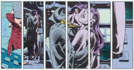 Un altro aspetto che allontana entrambi i testi dall’impostazione tradizionale della tavola è utilizzo di sottomultipli della vignetta, unità di montaggio un tempo piuttosto rare, ma oggi sempre più incisive nei comics d’oltreoceano, poiché spesso corrispondenti a sequenze di fermo immagine che contrastano con la concitazione delle scene d’azione. Le due tavole proposte, invece, sembrano utilizzare queste strutture di montaggio per rendere l’idea del tempo che scorre in un momento topico, in modo più efficace rispetto alla sua rappresentazione mediante singola vignetta. È forte, infatti, la sensazione di rivivere le fasi che portano all’abbraccio nel primo esempio riportato, o di percepire, nel secondo, gli stadi che conducono il giovane Bruce Wayne a voltarsi verso il proprio oggetto di interesse. L’impressione di una diversa scansione del tempo, in questo caso, è anche avvalorata dalla distribuzione del testo scritto, la cui disposizione conferisce alle quattro vignette che compongono il viso l’idea di una successione cronologica, nonostante esse compongano un’unica immagine statica. Resta da segnalare, ancora una volta, la possibilità di assimilare il sintagma voluto da Moore e la seconda striscia proposta da Miller alla concezione — evoluta -di “montaggio analitico” introdotta da Crepax, inteso sia come successione di dettagli, sia come percezione globale di più vignette complementari (e Roman Gubern, giustamente, traccia un parallelismo con l’analoga accezione della categoria elaborata da Pudovkin10). Notiamo, infine, il montaggio per analogia nella prima striscia in figura, poiché la ricorrenza di una simile continuità grafica sarà alla base degli aspetti sintattici e delle figure di transizione in esame nel prossimo paragrafo.