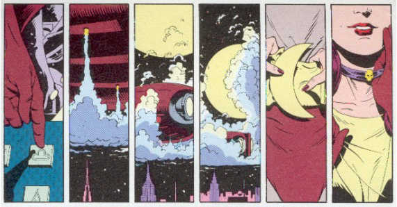 È vero che, tanto in Watchmen, quanto in Batman, la continuità temporale è garantita, o comunque è supportata, dall’abbondanza di fonti sonore diegetiche: dialoghi, monologhi interiori, onomatopee (questi soprattutto nell’opera di Miller). Tuttavia, le strutture di montaggio svolgono efficacemente, già da sole, il compito di fornire la giusta temporalità alle sequenze. Entrambi i fumetti giocano le carte della propria retorica sulla suspense, e sulla dialettica fatta di dettagli e primi piani; in sintonia con la prassi cinematografica, è fondamentale l’elemento della graduazione dei piani, sia in avvicinamento, sia in allontanamento rispetto al soggetto.