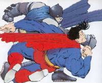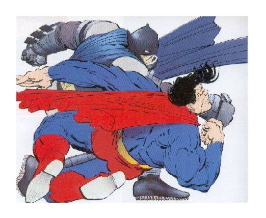 Questo fumetto emerge anche per un aspetto certamente non secondario, che ritroveremo con frequenza nella produzione dell’autore statunitense, da Give me liberty alla serie di Sin City, passando per Elektra: Assassin: la vignetta a pagina intera, che segna il culmine di determinati eventi a sottolineare la grandiosità dell’eroe. Il tassema si presenta ad intervalli pressoché regolari nella prima parte del volume, per poi proporsi sempre più assiduamente man mano che l’azione si fa più convulsa. In Watchmen tale possibilità viene respinta fino all’ultimo capitolo, che esordisce con una sequenza di ben sei pagine così strutturate. Tale concezione della vignetta, certamente lontana da un’impostazione tradizionale della tavola, specie se di formato così ampio, comprende anche i quadri in cui la monumentalità dei personaggi prende il sopravvento sull’azione descritta; un esempio è la lotta tra Batman e Superman, proposta nella figura a sinistra, che avvicina, per funzionalità, alcuni espedienti linguistici di Frank Miller all’impostazione grafica di Alex Raymond nelle tavole di Flash Gordon.