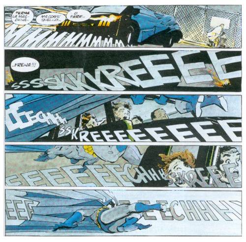 Dal fumetto non tradizionale, Miller passerà al cinema non tradizionale, ovvero quello di Hong Kong, ricordato da vicino con la serie Sin City, appartenente a quel particolare genere denominato “hard boiled”8. Nel nostro testo di analisi si ravvisano solo pochi elementi di ciò che emergerà con forza nella produzione successiva; il più evidente è il clamoroso utilizzo delle onomatopee come margine della vignetta.