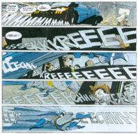 A parità di formato, le vignette di Batman (per comodità non riporteremo più il titolo integrale) sono più piccole, e non c’è dubbio che il ripetersi di sedici quadri lungo l’intera pagina produca un effetto, dal punto di vista retorico, analogo ai nove di Watchmen: la conseguenza più evidente, sul piano dell’inquadratura, è il prevalere, nel primo caso, di primi piani e dettagli, o di figure intere molto piccole. È comprensibile, quindi, che talvolta si renda necessario l’impiego di multipli della vignetta per rappresentare una situazione nel suo complesso, senza per questo allontanare il fumetto dalla parentela, non solo storica e tematica, con l’omologo di Alan Moore.