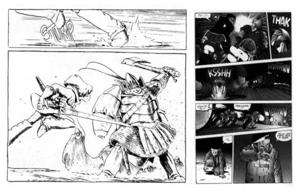 Inoltre, la forma linguistica che ne deriva è tipica di una produzione a noi non vicinissima, per quanto ormai diffusa presso il nostro pubblico: si tratta del fumetto giapponese, come dimostrano le illustrazioni che seguono, qui introdotte a scopo comparativo. Il manga, in particolar modo, predilige riprodurre, in questo tipo di vignetta, il dettaglio dell’azione, riconducendoci alle problematiche del montaggio analitico. L’esempio riportato, quindi, ci dimostra la provenienza delle molteplici fonti cui Miller fa riferimento.