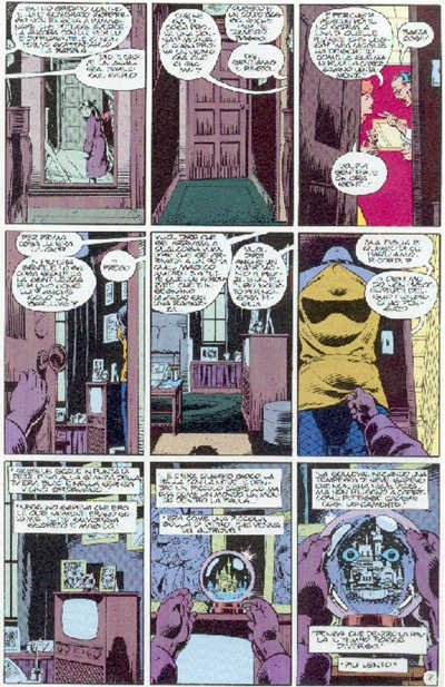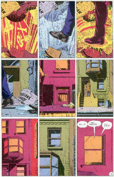 Inoltre, come vedremo nel par. 3, l’intera produzione di Miller è permeata di cultura televisiva e dei primi accenni ai new media; a queste caratteristiche riconduciamo il montaggio spesso nervoso e ritmicamente sostenuto, già anticipato dal delirante Ronin nel 19839, e che fornisce alla pagina un andamento talvolta vorticoso. La confusione solo apparente, nelle pagine di Miller, è generata dalla peculiarità dello stile grafico, espressivo ed espressionista in maniera del tutto lontana dal rigore quasi geometrico (come i particolari architettonici degli esterni) del disegno di Dave Gibbons.