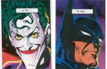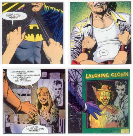 Poiché si ravvisa una continuità nel lavoro di Alan Moore alla fine degli anni ’80, si è ritenuto indispensabile un ricorso a The killing joke, opera estrema per quanto riguarda le tematiche legate al doppio e all’impossibilità, da parte dell’eroe così come del suo antagonista, di svincolarsi da ruoli complementari quanto necessari. Di conseguenza, l’albo propone pratiche di montaggio intimamente connesse all’argomento trattato, conducendo alla completa formalizzazione di forme linguistiche già fondamentali in Watchmen. Le soluzioni utilizzate dagli autori evidenziano una sintassi decisamente evoluta, e sono riconducibili a tre principali categorie: