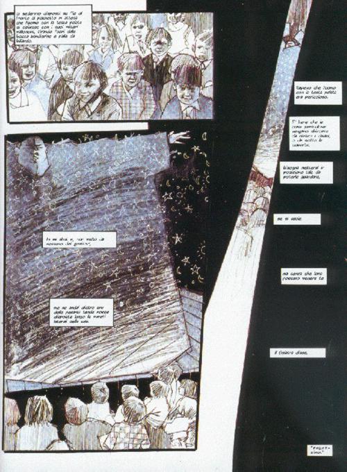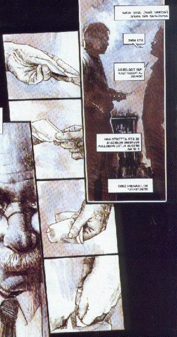 Quello che abbiamo tra le mani, tuttavia, è il loro primissimo lavoro, per la prima volta in Italia dopo dodici anni (otto, se consideriamo che la prima edizione a colori, quella americana pubblicata dalla Tundra, è del 1991, ed è quella considerata definitiva dagli autori). Una piccola gemma, una graphic-novel di dimensioni ridotte preziosa anche per chi ha avuto modo di godere, a suo tempo, della versione USA. Preziosa perché, oltre a testimoniare lo straordinario valore degli autori fin dall’esordio, lascia ben sperare in una futura edizione italiana delle loro collaborazioni successive. Certo, la qualità si paga: 22.000 lire non sono pochissime in rapporto alla quantità del materiale, ma per ora ringraziamo la Magic Press e tiriamo avanti, perché gli spropositi sono altri (mi riferisco alle 50.000 per “300” di Frank Miller, aggravate dal fatto che si attendeva un’opera sull’antica Grecia dai tempi di “Sesso e sangue a Sin City”, cap.5 e finale).
