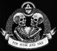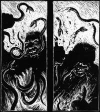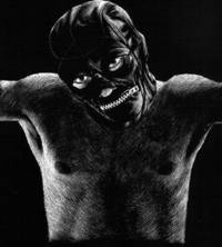 Ultimo genere cui si dedica Thomas Ott è l’illustrazione, a soggetto libero o ispirata ai classici della letteratura. A questa produzione viene giustamente dedicato uno spazio minore, utilizzando i vari disegni come intermezzo o per abbellire frontespizio, quarta di copertina ed altri “punti strategici”. La ricercata precisione con cui sono tratteggiate queste illustrazioni contrasta fortemente con i macabri soggetti rappresentati: una “tappezzeria” di volti che si fondono fra di loro, un Cristo sadomaso, lo scheletro di due gemelli siamesi uniti alle costole ed alle spalle, ecc…