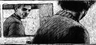 Se da una parte è innegabile che la caratterizzazione dei volti è solo accennata e affidata a piccoli elementi, dall’altra risulta molto più importante che le facce pressoché anonime dei protagonisti esprimano il più efficacemente possibile le loro emozioni. La feroce e delirante rabbia dell’attivista del Ku Klux Klan in Ten è resa in maniera pirotecnica ed i disegni, da soli, riescono a far capire al lettore quello che probabilmente nessuna didascalia, per quanto lunga o artefatta, potrebbe rendere con tanta chiarezza e vigore. Inoltre decifrare ed assimilare immagini così ben costruite e curate è anche un esercizio molto coinvolgente e stimolante per il lettore. Sul versante opposto, la “recitazione” dei personaggi di Ott emerge anche in situazioni più pacate. Un vero virtuosismo d’espressività applicato a quest’ambito è la penultima vignetta del racconto The Job, in cui il protagonista sorride compiaciuto di fronte ad uno specchio. I pochissimi, praticamente impercettibili, tratteggi che aprono il suo volto ad un sorriso bastano a compendiare tutta la violenta vicenda di sangue che è da poco terminata e ad esprimere la soddisfazione per la sua conclusione e per il macabro salario corrisposto. E quel sorriso così naturale funge anche da efficace contrappunto al racconto surreale di cui è l’epilogo.