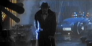 Ad un’attenta osservazione, l’aspetto visivo rivela come Gaff dimostri di possedere una prerogativa particolare: le sue entrate in scena sono improvvise ed inaspettate; si potrebbe dire che possiedano il vero e proprio carattere dell’apparizione. È questa una caratteristica che egli condivide solamente con un altro personaggio, Roy Batty. Le apparizioni di Gaff coinvolgono principalmente Deckard, il quale non può che assistervi passivamente: così avviene quando gli si materializza alle spalle mentre è seduto a mangiare, o quando, nuovamente sorprendendolo alle spalle, tocca con il suo bastone Deckard che, dopo aver ritirato Zhora, sta comprando una bottiglia di liquore28. Infine nel momento in cui appare sul tetto dove si è appena concluso lo scontro tra Deckard e Batty. A queste apparizioni, vanno aggiunte le sue altrettanto improvvise sparizioni, che hanno le stesse qualità delle sue entrate in scena, come ad esempio nel caso in cui durante l’incontro alla Tyrell Corporation fra Deckard, Rachel, ed il creatore di replicanti egli non è presente, pur avendo accompagnato Deckard, come mostrato dalle immagini precedenti, e riapparendo poi nel momento in cui si allontanano in auto dall’edificio.