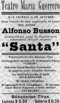 “Santa” ebbe un grande successo. Sui manifesti risultavano come interpreti “el Señor Alfonso Busson y la Señorita Elena Sánchez Valenzuela”, e il regista era Luis G. Peredo. Il nome del regista non veniva ancora pubblicato: con ogni probabilità veniva considerato un semplice artigiano. La proiezione era accompagnata da un’orchestra e da numeri di canto e danza.