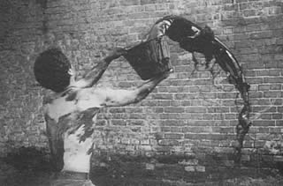 L’esperienza di Nicola Frangione è orientata verso quella che alcuni artisti definiscono: “drammaturgia delle arti”. L’attenzione al corpo come elemento espressivo fondamentale segna in maniera indelebile il suo lavoro. Nelle sue performances il corpo “smette di rendersi utile”: esso è, agisce di per sé; ha un rapporto di tipo rituale con lo spazio e con il silenzio che lo circonda. Gli oggetti sottolineano le valenze corporee con connotazioni simboliche: pane, olio, pietre. La parola è compressa nel corpo; essa agisce al suo intero e muore sulle sue labbra; il corpo non se ne separa, quasi fosse la sua anima, e punta sul coinvolgimento di tutti i sensi in una dimensione pre-linguistica. Lo spazio rappresenta la scena dello scontro percettivo, dello stupore sinestetico; il tempo segna la durata delle tensioni, dell’interrogazione, e determina il completo svuotamento dei ritmi quotidiani in favore di espansioni che finiscono per coincidere con i labirinti della memoria, al di fuori di qualunque dimensione storica, ma in una sorta di psicodramma.