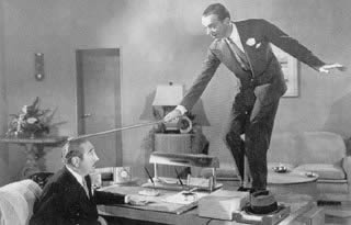 Questo quarto film di Fred e Ginger serve a fissare per sempre la figura di Astaire nell’iconografia del cinema musicale: il cappello a cilindro, il cravattino bianco, il frac con il bastone dal pomo dorato… È la formula di “Top Hat, White Tie and Tails” che Berlin trasforma in una particolare musica ritmata, per una sorprendente esibizione di Fred con un plotone di elegantoni nella stessa tenuta. È il famoso numero nel quale li abbatte uno ad uno puntando il bastone come un’arma: una prova di eleganza e sicurezza mai viste prima. Lo straordinario è che la sua figura allampanata, il suo viso lungo con le orecchie evidenti, tutto il suo stile, ricordano quello di un gentiluomo inglese agile e raffinato: non per nulla il pubblico inglese lo adorava, e per di più sua sorella Adele lo aveva reso cognato di un Lord.