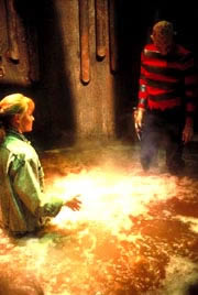 Per gran parte del film Krueger rimane una presenza impalpabile, un’ombra che si manifesta attraverso gli attacchi epilettici del bambino, una serie di telefonate anonime, le tracce lasciate dal suo guanto artigliato sulle pareti degli edifici o sui corpi di innocenti tecnici degli effetti speciali, uno sciame di scosse telluriche [affettuoso omaggio al primo capitolo in cui la presenza del mostro era comparata all’avvento di scosse sismiche] in un continuo rimando tra finzione e realtà. Solo nel finale si rivela mostrandosi in tutto il suo orrore. E sarà ancora una volta Nancy a dover cercare Freddy nel suo personalissimo Inferno, iconograficamente ispirato da opere quali la Divina Commedia di Dante e gli scritti del poeta romano Virgilio in cui si evidenzia la costante dell’entrata dell’Inferno come una immensa distesa di acqua. La Langenkamp vi accede così attraverso una rampa la cui uscita è data da un incisione della bocca aperta di Freddy e atterra in una sorta di piscina greco-romana. Qui riferimenti ai capitoli precedenti sono sparsi tra gli elementi scenografici, che ricordano certi dipinti di Salvador Dalì con il loro simbolismo macabro capace di ispirare sentimenti di disgusto e d’orrore con le sue linee spezzate e angoli acuti.