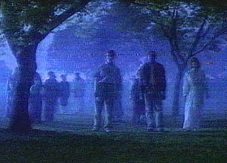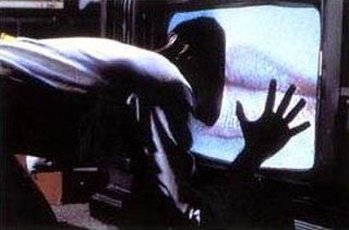 Con l’apparente morte di quest’ultimo entriamo nel secondo atto del film. Mentre il corpo svanisce in una nube sulfurea, lo spirito, reso attraverso un’immagine opaca, fortemente sgranata e mal definita con effetto video — cui si oppone l’immagine luminosa, cinematografica, in sovrimpressione del fantasma di Alison — si trasferisce con effetti devastanti prima da un canale all’altro del palinsesto televisivo (fuoriesce dai cartoni animati, telegiornali, sexy show e cult movie) poi da un corpo umano all’altro, provocandone la morte. “Succhia tutta l’energia del corpo di cui è ospite prima di abbandonarlo esanime” ci informa Jonathan costretto ad affrontarlo in un cartoonistico inseguimento attraverso una serie di corpi sempre diversi: dottoressa, poliziotto, marciatore, bambina, operaio, allenatore di calcio. Tutte persone rassicuranti e con un ruolo ben definito all’interno della società “regolare”, trasformate in massacratori(37).