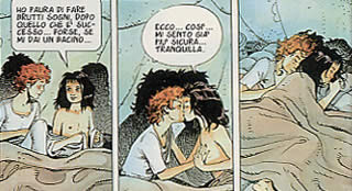 Innanzitutto desta qualche dubbio la forma mentis secondo cui un pedofilo possa essere attratto dalle sole scene in cui i bambini sono vittime di violenza (che sono appunto quelle ritenute più rischiose e che perciò vengono censurate): come abbiamo visto un nudo acerbo viene accettato, pur se sarebbe ingenuo credere che lasci indifferente chi ha certe pulsioni. Ma questa è una questione che esula dalle scelte editoriali e viene imposta, chissà quanto implicitamente, “dall’alto”: non rimprovereremo certo all’Eura di non censurare anche le immagini ritenute meno pericolose! Ma lo stato di cose generato da queste disposizioni crea una situazione paradossale. Se un minorenne si trova invischiato, anche solo marginalmente, in una situazione scabrosa allora si fa di tutto per nasconderlo (evitando così che i lettori più ricettivi possano venir sensibilizzati sull’argomento; ricordate le donne coraggiose che fino a pochi anni fa denunciando lo stupro passavano da vittime ad imputate? Ecco, il meccanismo è in pratica lo stesso: chi vuole criticare una data realtà viene ottusamente ricondotto ad essa e messo a tacere in modo brutale) ma se degli adolescenti o dei bambini, o comunque dei personaggi la cui resa grafica li riconduce a queste categorie, sono rappresentati senza veli o addirittura mentre intrattengono una relazione nessuno trova nulla da ridire. È come se accanto ad una pedofilia “cattiva” che ripugna (ma che non viene mai mostrata giungendo quindi a falsare i testi e ad annullare la tensione critica che la sottende) ve ne fosse una “buona” ed accettabile. Ragionando per assurdo, un discorso del tipo “chi stupra i bambini è cattivo e merita la morte” non è più logico (nell’ottica dei censori) di uno secondo cui “i buoni sono buoni e quindi possono per statuto fare l’amore con minorenni”?