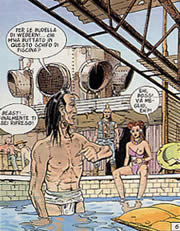 Nel primo caso (su Lanciostory 19 del 2001) siamo di fronte ad una bella e solida storia di origine francese: documentata, realistica (pur se romanzata) e molto avvincente. Ad un certo punto il protagonista, che fino a quel momento ha subito continue vessazioni (è un classico dell’avventura, no?) può finalmente vendicarsi di uno dei suoi antagonisti e lo raggiunge nella sua villa dove, nella versione originale, lo trova in compagnia di un giovane efebo. Don Perez Escalona è proprio un figlio di puttana (ricordiamo che Tramp è un fumetto avventuroso, in cui archetipi come questo sono irrinunciabili): ha ordito un piano machiavellico senza lesinare sui cadaveri ed ha persino tradito i suoi complici. È insomma un “villain” malvagio e viscido e i bravi Krahen e Jusseaume (gli autori del fumetto), consapevoli della tradizione letteraria in cui si inseriscono, lo caratterizzano anche fisicamente e psicologicamente in questo senso. Il lato più perverso della sua figura, cioè la pedofilia, ce lo rende ancora più odioso e i “buoni” risultano ancora più immacolati di fronte a un tale mostro. Ma nonostante sia stato scelto di mantenere pressochè inalterate la peculiarità di questo personaggio e la sequenza in cui ne veniamo edotti, l’Eura ha ritenuto che le immagini originali fossero troppo esplicite e di alcune vignette sono state preferite delle versioni “neutre”. Il risultato è un disastro.