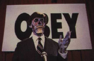 Ad esempio, un film come They Live di John Carpenter (1989) ci mostra degli alieni-zombie sotto mentite spoglie perché, normalmente, essi appaiono come persone normali: commesse, clienti, speakers televisivi, uomini politici, poliziotti che potremmo incontrare, e di fatto incontriamo, in qualunque cittadina (americana o europea); ma se si indossano degli speciali occhialetti che i protagonisti, due proletari americani, trovano in uno scatolone gettato via, allora le cose cambiano e vediamo, come in filigrana, tutto l’ordito che il potere ha predisposto per noi: un mondo improvvisamente minaccioso, fatto di cartelli e di scritte perentorie e le stesse persone che vedevamo prima ora ci si svelano per ributtanti mostri alieni dalle fattezze di zombie extraterrestri che sono poi una metafora, neanche tanto coperta, delle élite di potere che ci governano e ci controllano, utilizzando i media, la finanza o la polizia.
