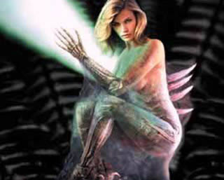 E ancora un’altra creatura di H.R. Giger nella serie di “Species” in cui un alien femmina che sembra una donna nubiana con delle strane acconciature, ma che veste all’esterno i panni di un’affascinante fotomodella svedese, cerca di accoppiarsi con degli umani, ma, per ragioni varie, finisce immancabilmente per ucciderli in modo atroce. È interessante la metamorfosi che la bambina Sil compie nel primo film Species di Roger Donaldson (1995) in cui la vediamo fuggire dal laboratorio di ricerca che l’ha praticamente generata, utilizzando le informazioni arrivate dallo spazio per costruire, da un DNA alieno, un essere vivente, e la sua metamorfosi in donna giovane e molto attraente che conserva però, come un fremito sotto pelle, i sogni e le emozioni animali che potrebbe sognare la sua controparte aliena e mostruosa.