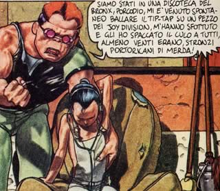 Esistono invece casi in cui una bestemmia propriamente detta viene usata con cognizione di causa e, magari anche involontariamente, svolge un’importante funzione comunicativa, andando a delineare immediatamente gli ambiti d’azione della vicenda. è senz’altro grazie al gruppo di Cannibale (e poi di Frigidaire, Il male, Frizzer, ecc.) che il tabù della bestemmia viene, se non infranto, perlomeno abbondantemente scosso. In tempi più recenti, Vincenzo Sparagna (nella posta di Frigidaire n°101) ed il misterioso Benedetto Alighieri (in Non bestemmiate, porca madonna!, su Il nuovo male settimanale n°0/7/8) si sono rivelati piuttosto leziosi nel difendere o giustificare tale scelta, arrivando quasi a sconfessare la spontaneità che aveva caratterizzato i lavori di Tamburini, Pazienza, Mattioli, Scozzari e Liberatore. La rabbia o la finta nonchalance con cui fanno capolino Dio e la Madonna nelle storie di Rank Xerox, Gatto Gattivo e della Traumfabrik sono entrambe i sintomi del mondo che ha prodotto tali personaggi, e che proprio a quel mondo si rivolgeva per ottenere ascolto e nuova linfa. Il disagio e l’emarginazione di molti giovani trovatisi adulti a ridosso del ’77 erano sia il motore di tali storie che la causa principale della presenza massiccia delle bestemmie in quei fumetti. Il malessere di tanti disgraziati, drogati ed emarginati trovava sfogo (seppure anche indirettamente o solo come semplice constatazione di un disegnatore che vedeva le cose dall’esterno) in queste storie che partendo alla lontana dall’underground americano arrivavano a conclusioni autonome e profondamente calate nella realtà italiana. Un’ottima testimonianza di quanto fumetto e società fossero uniti in questo frangente (una delle tante, ma almeno raccontata dalla viva voce di uno dei protagonisti) si trova nell’intervista a Stefano Tamburini pubblicata nel numero 5 di Flit (Stefano Tamburini, a cura di Michele Mordente, Art Core, Firenze, 1998, pag.40). A surrogare l’ipotesi della bestemmia come strumento di identificazione di una realtà desolata c’è, inaspettatamente, persino Milo Manara. Dopo aver manifestato le proprie impressioni sugli scontri tra polizia e studenti in H. P. e Giuseppe Bergman, il maestro di Verona inserisce nella seconda parte delle avventure di Bergman (l’episodio conosciuto anche come Dies irae, forse il migliore della serie) una patetica figura che fa appena in tempo ad urlare contro il protagonista prima di dileguarsi dal fumetto. L’incisività di questo “sballato” riesce a superare, proprio per la sua immediatezza, perfino la delirante sequenza del primo Giuseppe Bergman in cui un eroinomane vive la sua crisi d’astinenza mutandosi in un mostro informe. Pur giungendo dall’”alto” di una professionalità ben consolidata e di un disegno esteticamente ineccepibile, anche questa occorrenza della bestemmia serve a contestualizzare la situazione specifica che viene posta alla nostra attenzione. Esattamente così come il Ranxerox disegnato da Liberatore, ipertrofica evoluzione del vecchio Rank Xerox, non abbandonerà le sue blasfeme esclamazioni nemmeno sulle pagine patinate di Frigidaire. Anzi, nell’incompiuto I, me, mine corporation/La morte di Ranx Tamburini farà sfoggio di una vena creativa particolarmente ispirata che arriva a comporre, accanto a quelle canoniche, bestemmie memorabili come “Dio Ballard” e “Quant’è vero Asimov”. Citazioni, esercizi di stile ma sempre e comunque strumenti contestualizzanti. Sarà un caso che nel Ranx 3 scritto da Alain Chabat di bestemmie non c’è nemmeno l’ombra?