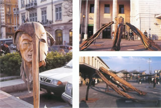 Un’altra visione, un generale dalla lunga palandrana in pelle mi viene incontro: “JEUNE FILS DU POLISSEUR ETHNIQUE AVEC DES JOUETS” è un mostro che da una parte tiene in mano una specie di bisturi e dall’altra al guinzaglio uno scheletro di cane. Tutto scorre elettricamente su un binario e quando il cane avanza lo fa quasi oscillando in un movimento amplificato dal giovane figlio di pulitore etnico che con i suoi giocattoli procede qualche metro dietro. Questo mostro, che mi pare un generale, invece è il figlio del pulitore e nello zaino di piombo non conserva nulla. Non riesco a restare fermo, la poltrona mi abbraccia, mi alzo per fuggire da quella sensazione che comincia nella coscienza, alla ricerca dell’origine del male che in me stesso pare lo stesso degli uomini. Scavalcate le mani e l’essere in croce giungo in una piccola stanza. La prima immagine è quella di un sarcofago, un’enorme matrioska vuota, l’icona ortodossa svuotata della sua sacralità, ma mi sbaglio. è una statua di donna all’incirca di due metri e mezzo, lignea, e dal ventre scavato che si apre come una porta. La faccia di donna per metà è legno, l’altra metà di un metallo che si sta per liquefare. Nel ventre interno, quasi come un’urna, compare la faccia di un bimbo grassoccio. Mi avvicino e sulla spalla della scultura è attaccato il corpo vestito di un uomo ma senza la testa…