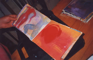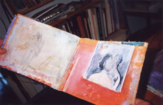 Per altri versi, anche le immagini costituiscono una narrazione. È l’esempio dei libretti che ho fatto mettendo assieme delle piccole tele che avevo dipinto.: una sorta di diario dove posso raccontare tutto quello che voglio. Si tratta di una narrazione, scritta e pittorica, in riferimento a delle situazioni reali, pensieri nati dall’autoreferenza. L’uomo che ascolta se stesso attraverso le cuffie, ad esempio: il tutto accompagnato dallo scritto. O ancora, la donna che si guarda allo specchio e si vede uomo, o la donna che osserva le proprie piaghe.