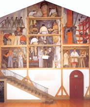 Il suo primo risultato americano è una “Allegoria della California” sulle pareti della Borsa di San Francisco dove vengono raffigurati molti protagonisti della cultura, dello sport e delle tradizioni locali. Segue subito un altro affresco alla Scuola di Belle Arti che rappresenta minutamente i tempi e i modi dell’esecuzione di un “mural” messicano. Poi si sposta a Detroit per un ciclo dedicato alle attività del grande centro industriale, sul tema “L’uomo e la macchina del tempo”.