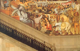 Siamo a metà del 1921. Rivera fa appena in tempo a raggiungere il suo Paese, che si trova già coinvolto -quasi d’autorità — nel programma governativo tracciato dal ministro Vasconcelos. Sono trascorsi gli storici dieci anni della guerra civile e, come abbiamo già visto, il nuovo governo vuole che i cittadini conoscano la loro storia per mezzo delle pitture murali, affidate ai più competenti artisti disponibili: Rivera innanzitutto, ma ci sono anche Siqueiros, Orozco e alcuni altri, di cui diremo fra poco.