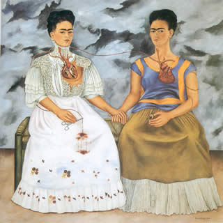 Vediamo una Frida con il suo costume da “tehuana” seduta accanto all’altra, che le tiene una mano: entrambe hanno il cuore scoperto. “L’altra” è un’elegante signora vestita di pizzo bianco, e i due cuori comunicano attraverso una sottile arteria che oltrepassa la Frida in bianco spargendo il sangue sul delicato tessuto. Entrambe hanno un volto triste e quasi inespressivo: una è un po’ più scura di pelle, l’altra è pallida, secondo l’origine europea e messicana di Frida.