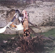 Scavalcate le mani e l’essere in croce giungo in una piccola stanza. La prima immagine è quella di un sarcofago, un’enorme matrioska vuota, l’icona ortodossa svuotata della sua sacralità, ma mi sbaglio. è una statua di donna all’incirca di due metri e mezzo, lignea, e dal ventre scavato che si apre come una porta. La faccia di donna per metà è legno, l’altra metà di un metallo che si sta per liquefare. Nel ventre interno, quasi come un’urna, compare la faccia di un bimbo grassoccio. Mi avvicino e sulla spalla della scultura è attaccato il corpo vestito di un uomo ma senza la testa…