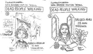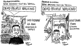 Quotidianamente, nella prima metà di marzo, Vauro Senesi ha pubblicato sul Manifesto una serie di vignette dal titolo “Figurine di guerra, serie Baghdad, i volti del nemico” e, inquietantemente presago delle parole di Bush figlio, dal sottotitolo “Dead People Walking”.