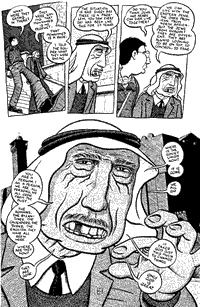 C’è una pagina bellissima in cui, seguendo la lezione di Gianni De Luca, Joe Sacco affastella immagini e balloon per raccontare la velocità con cui il vecchio lo costringe ad attraversare il sito (“Cita la Bibbia e il Corano come se stesse facendo la cronaca di una corsa di cavalli”). A chiusura della vicenda, dopo un litigio tra la guida e un gruppo di coloni, c’è un quadro che copre 2/3 dell’ultima pagina e ci offre un primo piano del vecchio che ne mette in evidenza volto e mano sinistra. Il viso, per nulla amichevole, è irregolare e dai tratti sghembi, rugoso e olivastro. Il capo è coperto da un fazzoletto bianchissimo, gli occhi sono sottili e la mano, che vive di gesti contenuti (in Sacco nessuno gesticola, spesso si indica, talvolta ci si afferra), mette in evidenza unghie rovinate dai lavori manuali.