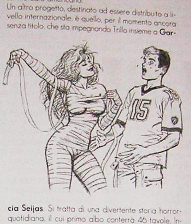 Non so a cosa si riferisce Fumo di China quando parla della storia “horror-quotidiana”: deve essere una storia di Streghe (che in Italia pubblicò l’Eura), che ci venne comprata da un editore argentino che produceva una pubblicazione formata da un film dell’orrore allegato a un giornale a colori con la nostra serie Le Streghe (Agatha e sua nipote) o forse quel lavoro per Ervin di cui restano 12 tavole in un cassetto.