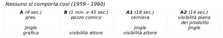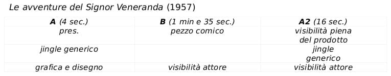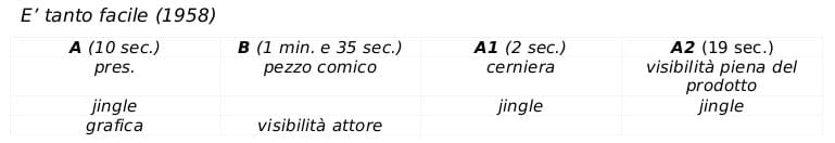 Si trattava di un soluzione tradizionale – ancora nel 1969 veniva adottata nel 45,4% dei caroselli -, nella quale le modalità di passaggio fra B e A1 – A2 vengono pilotate da un elemento verbale e sonoro, introducendo, come si è osservato, un tasso di fluidità decisamente modesto. Nella struttura di fondo il carosello restava dunque estraneo a quelle sperimentazioni compositive che cercavano di superare la cesura imposta dalla Sacis attraverso la ricerca di un modello “unitario”. Sul piano visivo, la continuità era soprattutto assicurata dai volti degli attori che transitavano nello sviluppo A – B – A1. Può risultare utile a questo punto tradurre nello stesso linguaggio formale le serie precedenti:
