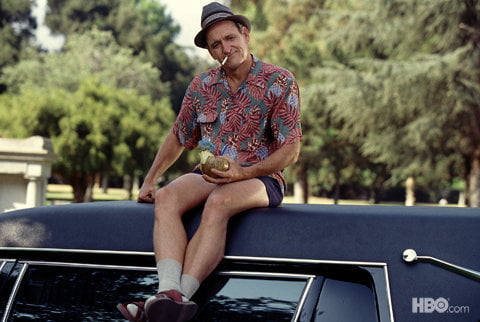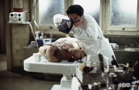 David Fisher presiede allo svolgimento di una veglia funebre presso l’impresa di famiglia. Come d’abitudine, il corpo della defunta giace nella bara aperta per permettere a familiari e amici di darle l’estremo saluto. Un signore anziano, forse il marito della donna, si complimenta con David per l’ottimo lavoro svolto nel rendere così sereno il viso della defunta, solo per commentare successivamente “if there’s any justice in the universe, she’s shoveling shit in hell” (“se c’è giustizia nell’universo, starà spalando merda giù all’inferno”). Il dialogo italiano sostituisce merda con sterco che, oltre ad essere d’impatto sicuramente inferiore, sposta la battuta da un territorio di crudezza cinica ad un commento quasi letterario, annullandone l’effetto paradossale.