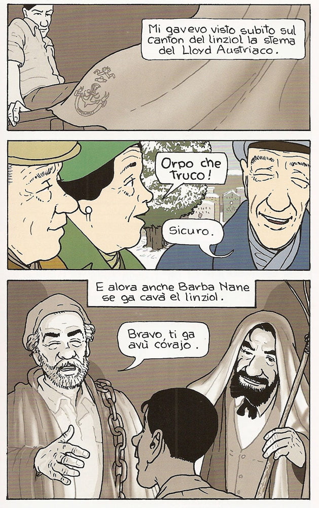 WC: Sì, però, mettiamo fermo il punto che non sono storie mie ma sono storie di Carpinteri & Faraguna, che io ho solo tradotto in sceneggiatura e quindi in immagine. Sono molto triestine pur essendo di ambientazione istriano-dalmata, ma non so cosa voglia dire “divertimento triestino”. A parte alcuni vocaboli particolari che fanno divertire più chi li conosce in quanto dialettali, le storie sono delle grosse barzellette. Sembrano racconti molto seri, ma in fondo nascono con la battuta finale, sono costruiti su questo. Credo dovrebbero divertire chiunque abbia il coraggio di leggere questo dialetto, col quale ho avuto difficoltà anche io la prima volta. È un po’ come leggere Camilleri con quello strano siciliano: bisogna prima impararlo un po’, e poi si gode.