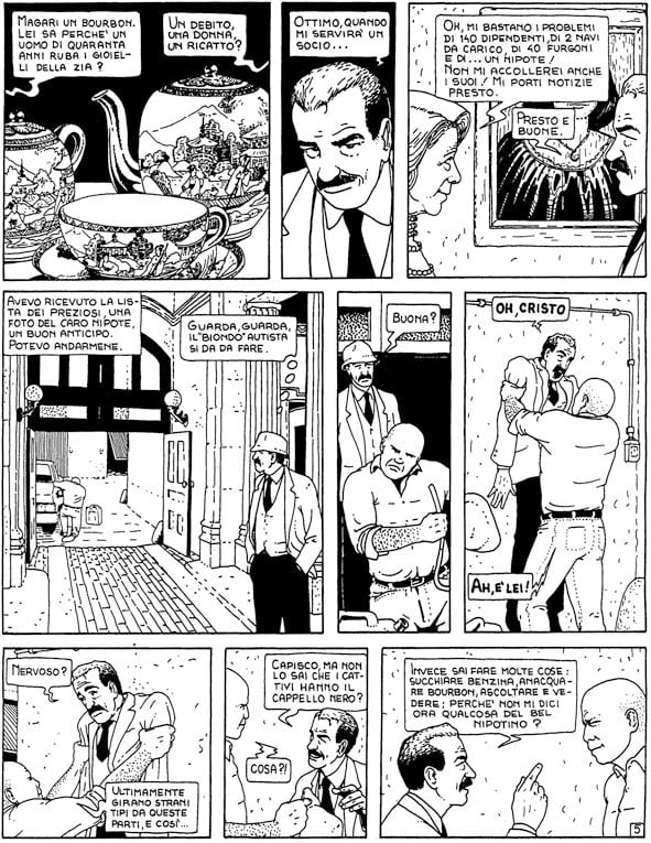 WC: Non veramente, perché il flashback può diventare noioso. È molto difficile non annoiare con un sistema che diventa ripetitivo specialmente ne Le Maldobrìe, dove continuamente bisogna tornare dentro la pescheria o comunque ai due personaggi narratori, e poi ritornare nella parte raccontata perché è quella più esteticamente interessante. È difficile mantenere l’attenzione continuamente: infatti Bortolo e Siora Nina non sono sempre nella pescheria. Delle quasi 200 pagine de Le Maldobrìe che ho già fatto, ne avrei disegnato 60 sempre nello stesso luogo. Sarebbe stata una cosa terribile, e quindi ho dovuto immaginare Bortolo e Siora Nina che vanno in corriera, che vanno in un negozio, che si incontrano per strada, oppure, come in una delle ultime, addirittura in un cimitero a far la visita del 2 novembre. È obbligatorio dare un po’ di vita.