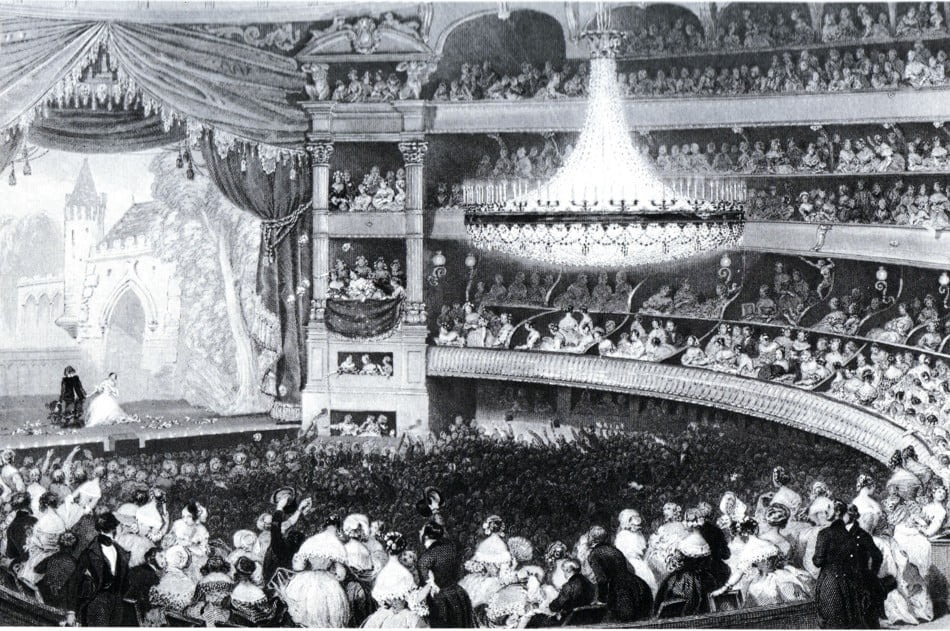 Uno dei primi tentativi di utilizzare le canzoni all’interno dei testi teatrali è a opera di Molière, che nel 1664 inserisce delle parti cantate nell’intermezzo de Il matrimonio per forza, per poi proseguire l’esperimento nel 1667 ne Il siciliano ossia l’amor pittore. La vera svolta, tuttavia, arriva nel 1697 con la cacciata dall’Hôtel de Bourgogne dei Comédiens-Italiens, che amavano arricchire i loro spettacoli con vaudeville che parodiavano celebri opere. La loro espulsione è fondamentale poiché numerosi commediografi cercano di occupare il posto lasciato vacante per riprenderne il repertorio. Questo induce la Comédie-Française, che non vedeva di buon occhio gli attori “di strada” e li considerava dei concorrenti sleali, a perseguitarli impedendogli di mettere in scena i loro spettacoli. Gli attori, per evitare di essere arrestati, prendono quindi l’abitudine di presentarsi sul palcoscenico con dei rotoli di pergamena sui quali è scritta la loro parte, e decidono di mimetizzare tra il pubblico alcuni complici incaricati di incitare gli spettatori a leggere ad alta voce quanto scritto nei rotoli. Se in un primo momento le loro parti sono solo in prosa, in seguito lo stesso stratagemma viene utilizzato per le parti cantate, con somma gioia del pubblico che si diverte ad essere pienamente coinvolto nell’azione. Le pièces teatrali iniziano così a essere intervallate, se non interamente composte, da vaudeville.