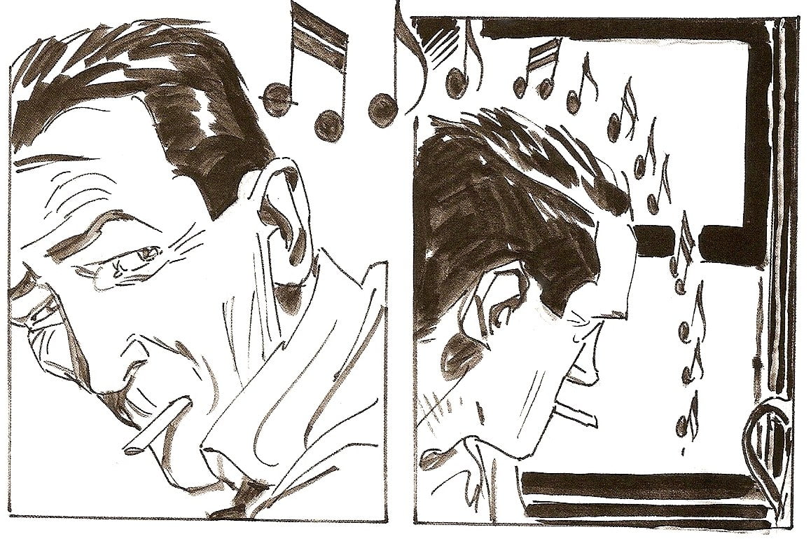 Continuando in territori lontani dal western, approdiamo a due altre opere che, seppur diverse, hanno in comune l’ambientazione hard boiled, alla Chandler o Hammet. Mi riferisco a Marvin il detective e a Tom’s bar. Il primo, comparso su Orient Express nel 1982, vede un ex attore di western muti, ferito nella prima guerra mondiale e con un matrimonio finito male, indagare alla fine degli anni Venti in una Hollywood cinica, violenta e rozza, che stride con l’immagine comune da macchina dei sogni. Il secondo è un barista, malavitoso in pensione nella Chicago anni Quaranta, saggio e rispettato, attorno al quale si muove un’umanità dolente e sconfitta. I tuoi disegni in bianco e nero riescono a rendere perfettamente le atmosfere noir e l’espressione dolente dei volti disillusi: ancora una volta fai recitare i personaggi comunicando le loro emozioni.