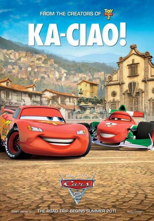 Cars 2 supera di molto le aspettative create dal proprio titolo, che lascia presumere trattarsi del sequel della storia di formazione dello spaccone che impara ad apprezzare i veri valori della vita. Il solo legame con il film precedente, infatti, è costituito dall’impiego di alcuni dei medesimi personaggi (la maggior parte in ruoli assai più defilati) e dagli accenni ad un “prima”, la cui conoscenza non è indispensabile alla comprensione della storia. Protagonisti di questo lungometraggio sono, infatti, due agenti segreti britannici – un’Aston Martin (e cosa, se no?) e una moderna macchina sportiva iperaccessoriata – che scambiano il carro attrezzi Cricchetto, in giro per il mondo al seguito di Saetta McQueen impegnato in un campionato promosso dal produttore di un nuovo carburante ecologico, per il loro contatto nell’intelligence americana, coinvolgendolo nell’indagine su un’organizzazione criminale internazionale impegnata nella realizzazione di una nuova arma.