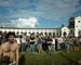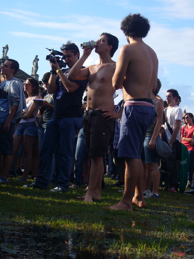 Peccato, si gongolava al pensiero di saltare e gridare a squarciagola (sì, magari anche sotto la pioggia, se le coperture dei palchi fossero mai esistite) “Mai come voi” o ballare un tango tra erba bagnata e lampi durante “La faccia della luna”. Sappiamo da qualcuno che i Fine before you came hanno dato forfait, ma solo perché uno di loro si è sentito “fine after you came”: il cantante è diventato papà all’improvviso. Le acque che si rompono, però, sono altre: il muro di pioggia si abbatte inesorabile, e il porticato che circonda lo spiazzo diviene in pochi istanti riparo per centinaia di persone, che, dopo mezz’ora passata a stendere teli, rimediare barattoli di birra, brontolare (un francesismo) per la puntualità svizzera dello “strangolino” (termine triestino che ben rende l’entità del diluvio) fumare e fare scongiuri (inutili, lì sopra non ricomincia a suonare nemmeno Poseidone), formano una platea allungata come una grande salsiccia.