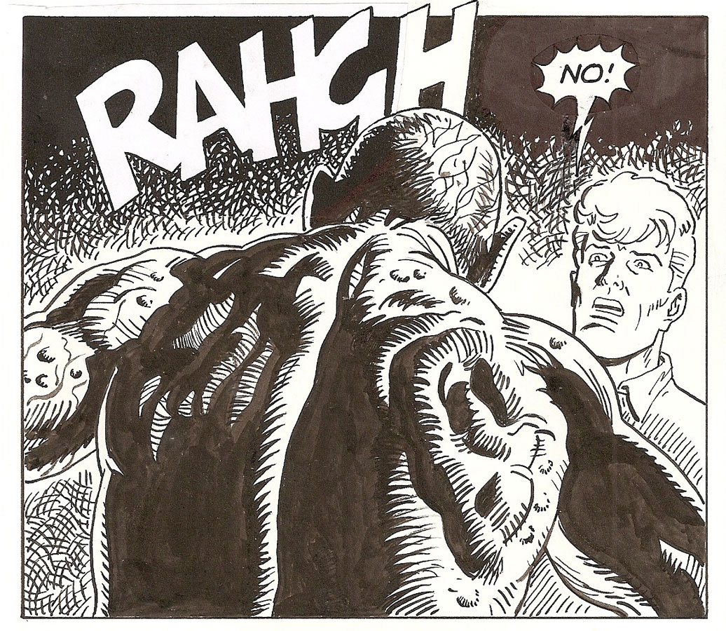 AO: Poco meno di due anni fa, le tue tavole furono protagoniste di un’altra mostra, intitolata “Nuvole a Trieste”, organizzata dall’Assessorato alla Cultura del Comune di Trieste e curata dall’infaticabile Dario Fontana di NonSoloLibri. In quel caso, tuttavia, non eri l’unico espositore, in quanto la mostra voleva celebrare i disegnatori triestini di fumetti attualmente in opera ovvero, oltre a te, Mario Alberti, Walter Chendi, Ambra Colombani, e i fratelli Lorenzo e Alessandro Pastrovicchio. Fra tutti tu sei il decano, l’artista con la più lunga esperienza: si può dire, vista la piccola dimensione della città di Trieste, che hai visto nascere e crescere gli altri disegnatori. C’è forse un filo conduttore che lega tutti o, parte, di voi? Hai magari avuto un ruolo di guida o, per lo meno, di suggeritore di buoni consigli nei confronti di qualcuno degli altri? E ora mantenete dei rapporti di scambio di idee e di confronto reciproco?