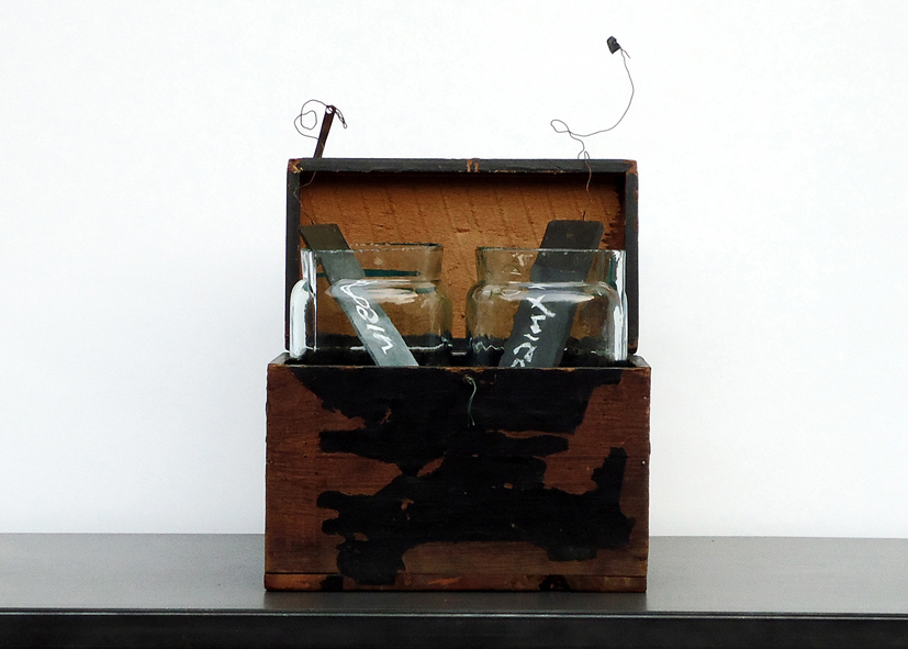 La casa di Carol Rama è un’opera d’arte piena di oggetti curiosi e teatrali, una fonte d’ispirazione per Andrea Guerzoni che, dopo una lunga e costante frequentazione con l’artista, ha ideato, progettato e curato l’allestimento della mostra Quanta luce nel nero in cui convivono opere pittoriche e grafiche dei due artisti torinesi e installazioni di oggetti che richiamano il mondo di Carol Rama. Scrive Corrado Premuda nel testo di presentazione in catalogo: “Questi utensili per improbabili stregonerie dialogano qui con le opere grafiche e pittoriche di Andrea Guerzoni e con tutto l’immaginario estetico di Carol Rama e il risultato non prende solo la forma di un omaggio, ma di una vera e propria dichiarazione d’amore.”