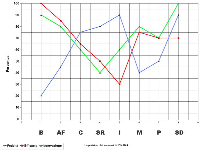 Al termine di questa ricognizione all’interno delle trasposizioni cinematografiche messe in variazione all’interno della semiosfera dickiana, possiamo tentare di trarre un bilancio sulla fortuna espressiva di tali trasposizioni, in altre parole valutare la bontà delle configurazioni enunciative che si sono poste come estensioni audiovisive dell’opera di Dick. I grafici che seguono sono motivati dalle schede concernenti i film e tiene conto, ad un primo livello, dell’efficacia pragmatica dei differenti ipertesti dickiani; mentre in un secondo momento rende conto della fedeltà (concetto ambiguo accettato non senza riserve in ambito semiotico) intesa come continuità o distanziamento rispetto a un testo fonte. Per innovazione intendiamo la misura del grado di estetizzazione ricercata dal film, unita all’efficacia dell’uso di determinati codici plastici per ricreare gli effetti di senso del testo dickiano.