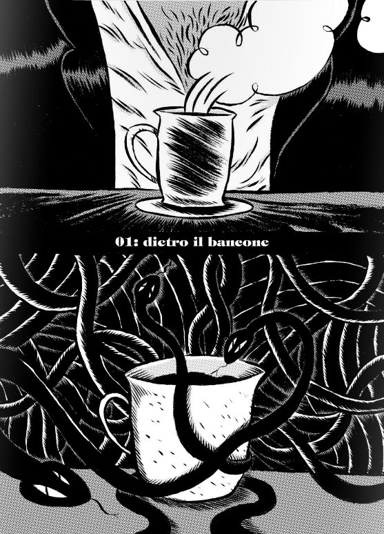 Le danze si aprono con Dietro il bancone, una breve storia in cui l’orso Sigfrido trova il modo di annullare due disperate solitudini in un’unione semplice quanto geniale: Caetano Crayon è un supereroe fallito perchè reso cieco in battaglia, Erminia è una gorgone condannata a pietrificare gli uomini che posano il loro sguardo su di lei («Quei poveretti li uccido di amore!»). Sigfrido è il loro postmoderno sensale di fidanzamento, che come il suo autore coniuga l’estetica pop fracassona dei fumetti Marvel con la cultura classica, in un gioco che Rubín porterà avanti quando possibile anche nelle altre storie.