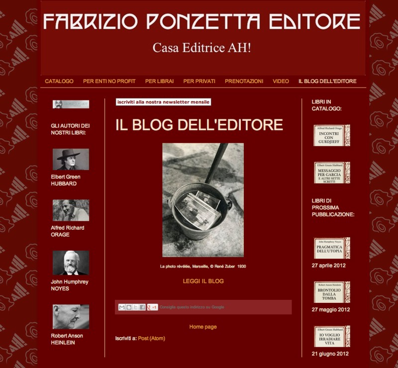 Fabrizio Ponzetta (FP): L’anno scorso avevo prodotto dei libretti goliardici che sfottevano la mania della manualistica psicologica, tipo Come fare di tuo figlio un coglione o Rovinarsi la vita in sette giorni ed il nome “AH!” per la casa editrice era adeguato. Poi sinceramente non ho retto il gioco, i libretti sono carinissimi ma, mio malgrado, io sono una persona seria. Una notte ho sognato i miei autori preferiti, quelli che mi hanno segnato profondamente e questi mi hanno detto: “Senti un po’, il mondo è un casino, tu fai l’editore e noi in Italia siamo fuori catalogo, non ti sembra il caso di smetterla di fare il deficiente, acquisire i nostri diritti e pubblicarci?”. Detto-fatto. Ho creato una collana come Fabrizio Ponzetta Editore, a cui mi dedico principalmente, ed ho acquisito i diritti di due inediti di Heinlein, scovato testi di Noyes, Orage, Elbert Hubbard e, presto, William Morris.