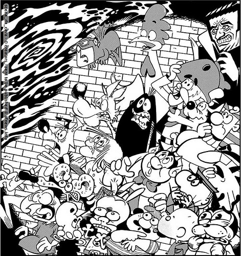Venendo ad anni più recenti e al campo del fumetto, un precedente illustre di Puck Comic Party, da cui Ivan Mannuppelli ha ripreso l’utilizzo condiviso di un unico personaggio, è The Narrative Corpse (“Il Cadavere Narrativo”), opera che già nel titolo dichiara esplicitamente il recupero dell’esperienza surrealista, e la particolare applicazione di questa tecnica alla sfera del racconto per immagini. Progettato e gestito dal celeberrimo Art Spiegelman e uscito nel 1995, dopo cinque anni di lavorazione, questo fumetto collettivo è nato dalla collaborazione di sessantotto autori del calibro di Will Eisner, Matt Groening, Joe Sacco, Gilbert Shelton, José Muñoz, Marc Caro, Charles Burns, David Mazzucchelli, Thomas Ott, ed anche di tre autori che hanno partecipato all’avventura di Puck: Bill Griffith, Jay Lynch e Robert Sykoriak.