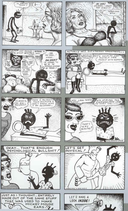 Mi sono imbattuto, nel flusso dei commenti di Facebook, in un breve scambio di battute tra Jay Lynch ed altri amici scaturite da queste video-note del fumettista serbo, in cui sono emerse interessanti prospettive di riflessione, che ripropongo. Un storia del genere non è pertinente al pensiero razionale e non è sostenuta da un saldo scheletro costruito con le precise tecniche del mestiere di raccontare; non poggia su una struttura ragionata, ma sulla giustapposizione di “poesie visuali”, di brevi lampi sinestetici eruttati dalle viscere, singoli tasselli incastrati in un unico flusso, come beat pulsanti che compongono una sinfonia ottica improvvisata e coinvolgente. Molti dei piccoli scompartimenti di questo treno di vignette sono opere molto aperte e simboliche, dal valore fortemente connotativo ed evocativo, e lo sguardo soggettivo dello spettatore, di fronte ai singoli riquadri così come a tutto l’unicum, gioca un ruolo molto importante nell’interpretazione del senso e nel rintracciare possibili livelli di lettura e corrispondenze, anche intra e intertestuali.