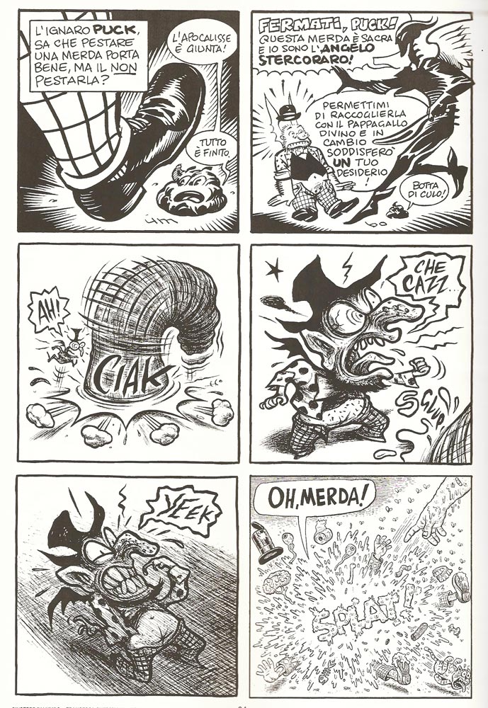 Puck Comic Party è un’opera che frantuma la narrazione classica, un fumetto decostruito e delirante che con il suo incedere saltellante e frammentario, per microepisodi, fa a pezzi le norme eterne e universali della diegesi. Questo grande puzzle è improntato ad una non-logica che ha molte più affinità con l’esperienza del sogno o dell’allucinazione che con la percezione della coscienza in stato di veglia e con i meccanismi dell’emisfero sinistro del cervello; in tale esperimento la straordinaria potenzialità offerta dal medium fumetto di generare facilmente mondi immaginari ed effettuare grandi spostamenti nel tempo e nello spazio è dunque sfruttata al massimo, portata al parossismo, in una plurale esaltazione di quella che Daniel Clowes ebbe a definire, per bocca di un suo personaggio, «la natura mercuriale della vita da questa parte del proscenio (nei comics, n.d.r. e t.)»