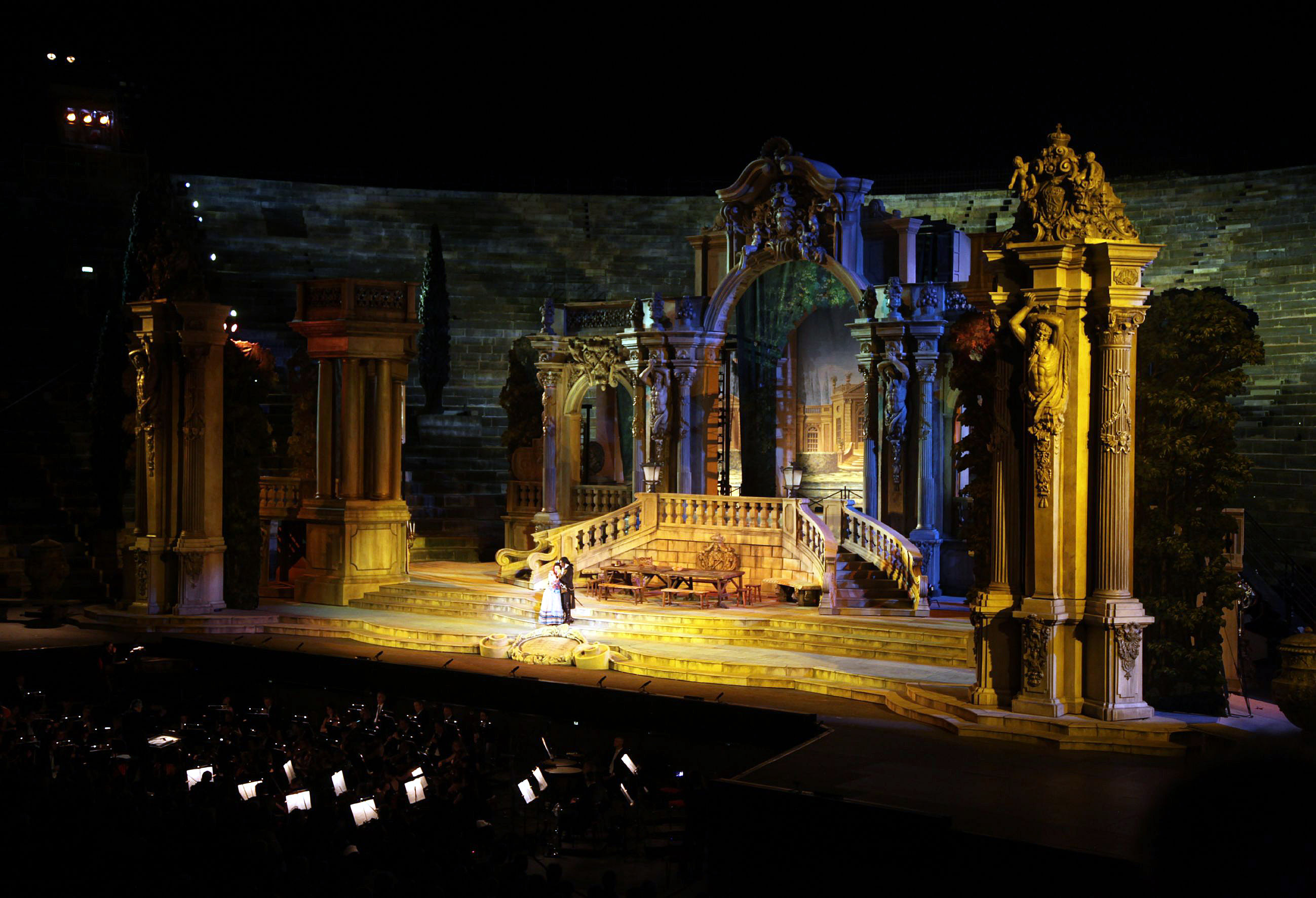 L’amore dà spettacolo… è il motet al quale la stagione operistica areniana 2012 è ispirata. Un sentimento spettacolare, in tutte le sue forme, che nel caso del melodramma da secoli si colora di variopinte tonalità. Solo per limitarci al cartellone proposto, celeberrimo è il Don Giovanni di Mozart che ben spiega come in ogni uomo alberghi il desiderio incandescente − al di là dei doveri e della decenza − di nuotare nel mare infinito dei piaceri sensuali. Il classico immancabile in terra scaligera è l’amor contrastato dell’Aida di Giuseppe Verdi, dove al sentimento tra due amanti si contrappone quello per la patria. Carmen e Roméo et Juliette lambiscono gli antipodi del dardo incandescente dell’amore: quello sprezzante, irriverente e quello puramente infantile. Turandot è l’amore come rebus psicologico, quindi da conquistare con l’astuzia. Tosca, invece, mostra le pene di un amore vittima del raggiro e delle malignità, quindi da difendere fino alle estreme conseguenze.
