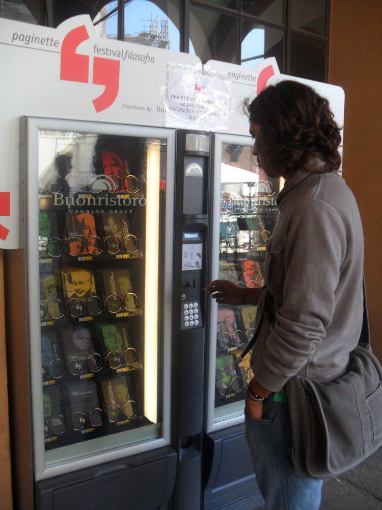Paginette: 101 libelli che si acquistano nei distributori automatici delle merendine. La collana raccoglie le lezioni magistrali delle edizioni precedenti. Inserire la moneta, digitare il numero e il filosofo in copertina avanza fino a cadere nelle mani dell’affamato.